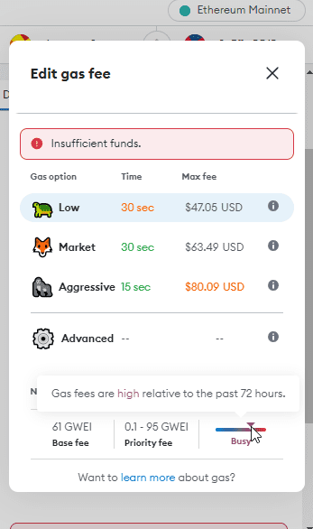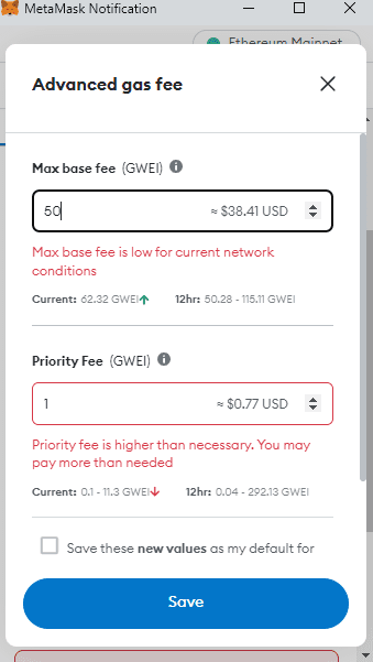 Without knowing the technicals, you can play with custom fees and Metamask will tell you if they’re a good choice. By default, it shows everything in ETH decimals or GWei. You can switch to USD format from settings: