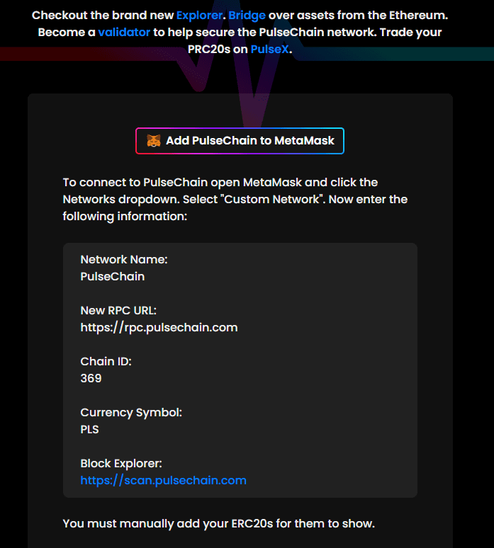 The latest Metamask versions allow you to add these common networks with a few clicks. But if the one you need doesn’t appear, you can manually add the blockchain using the address from the official site. For example, here’s how to add Pulsechain Mainnet to Metamask: