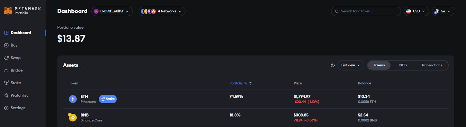 One of the latest 2023 features is the Metamask Portfolio. Not only does it show all your tokens across networks, but it brings to one place many basic DeFi features like staking, bridges, or token exchanges.