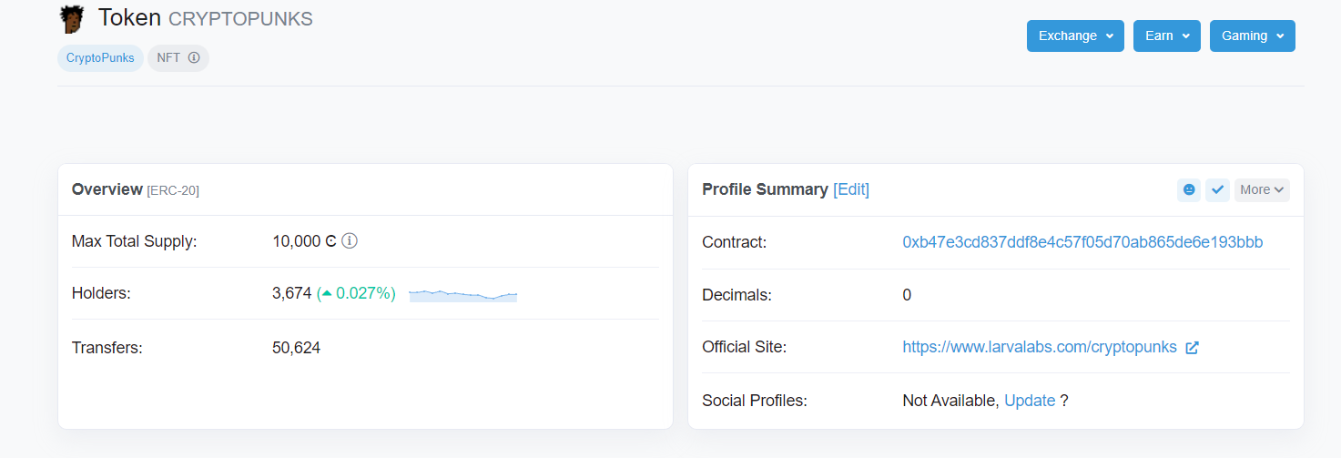 Cryptopunks (June 2017) is the first popularized NFT collection on the Ethereum blockchain. Each cyberpunk belongs to the same contract under a different ID, each with different values. For example, this contract has a supply (or collection size) of 10,000 NFTs: